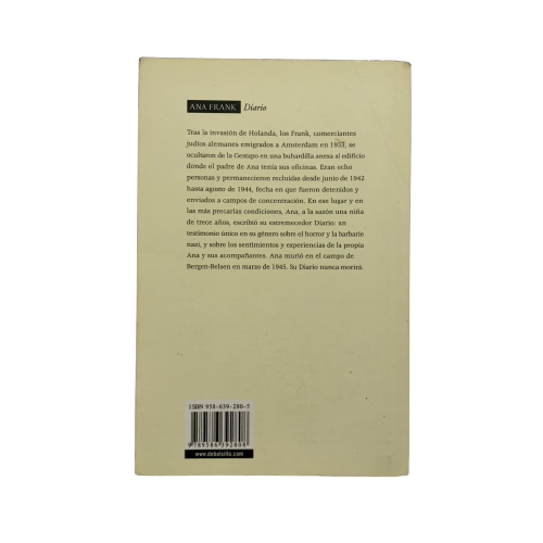 Oculta con su familia y otra familia judía (los Van Daan), en una buhardilla de unos almacenes de Ámsterdam durante la ocupación nazi de Holanda. Ana Frankcon trece años, cuenta en su diario, al que llamó «Kitty», la vida del grupo. Ayudados por varios empleados de la oficina, permanecieron durante más de dos años en el achterhuis (conocido como «el anexo secreto») hasta que, finalmente, fueron delatados y detenidos. Ana escribió un diario entre el 12 de junio de 1942 y el 1 de agosto de 1944. El 4 de agosto de 1944, unos vecinos (se desconocen los nombres) delatan a los ocho escondidos en «la casa de atrás». Además del Diario escribió varios cuentos que han sido publicados paulatinamente desde 1960. Su hermana, Margot Frank también escribió un diario, pero nunca se encontró ningún rastro de éste.
